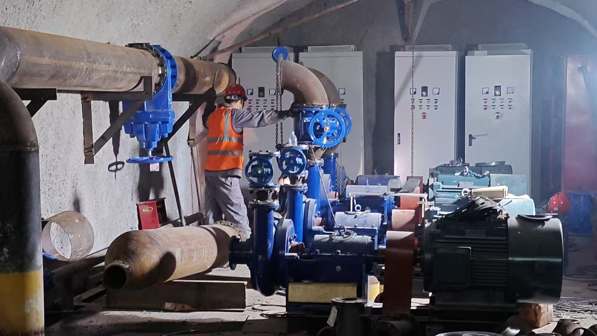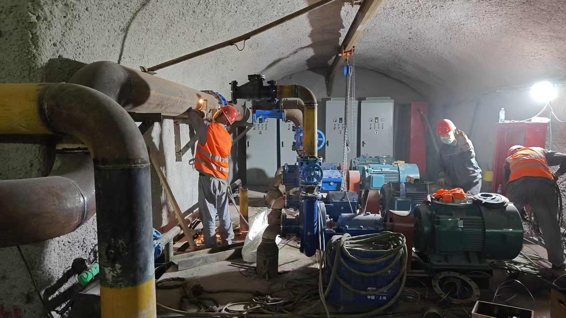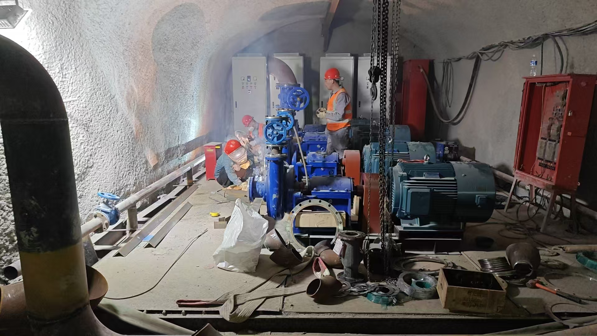 根据铁路隧道的工程进度,第三批主排水泵已进场完毕,立即投入紧张的安装工作。第三批主排水泵清水泵功率为90KW 4台,污水泵功率为75KW 4台,共计8台,为不耽误工程整体进度,安装工作设备进场立即开始,预计将按期完成安装工作,在端午节后开始调试。
