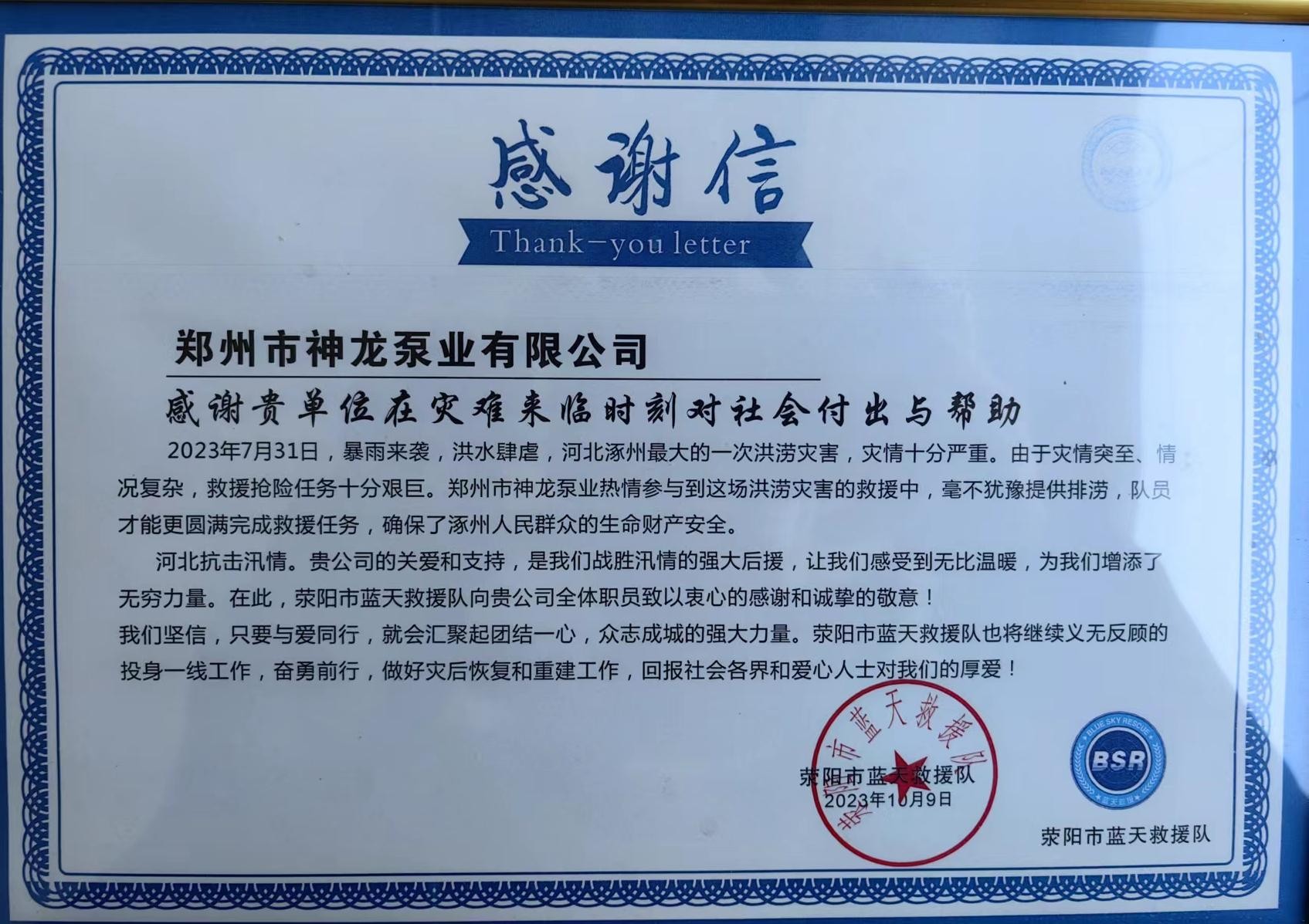 蓝天救援队感谢信